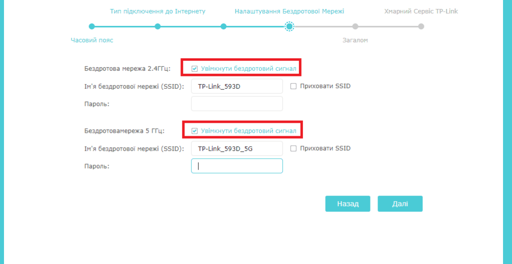 Оберіть назву та пароль для wifi-мережі. Роутер TP-Link двохдіапазонний, то ви можете вказати окремі назви та паролі для мереж 2.4ггц та 5ггц.